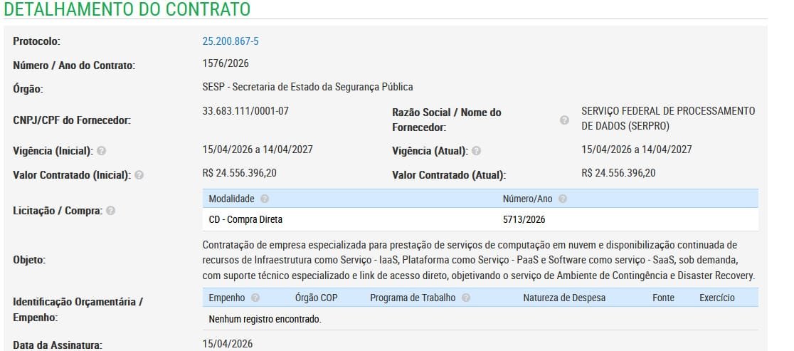 A Secretaria de Segurança Pública do Paraná (SESP-PR) e o Serpro, assinaram o contrato nº 1576/2026, no valor de R$ 24,56 milhões e com vigência de 12 meses. O objeto do contrato é a prestação de serviços de computação em nuvem sob demanda, incluindo os três modelos de serviços terceirizados (IaaS, PaaS e SaaS), com suporte técnico e foco explícito em ambiente de contingência e disaster recovery. Permitirá ao governo do estado alegar que cumpriu o mandamento da segregação de dados sensíveis da SESP-PR, armazenados na Celepar, que não poderão ficar em empresa privada que adquirir a estatal paranaense.