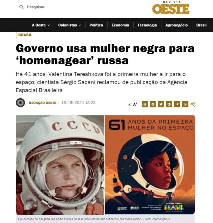 A Agência Espacial Brasileira (AEB) publicou neste domingo (16) uma polêmica peça publicitária, comemorativa aos 61 anos que a primeira mulher foi ao espaço. Não seria nada anormal, não fosse o fato de que a peça promocional trazia estampada a ilustração de uma astronauta negra, enquanto que a primeira cosmonauta russa Valentina Tereshkova era branca. Foi o suficiente para internautas interpelarem a AEB e ser travada mais uma guerra identitária entre simpatizantes da esquerda e da direita na rede social “X”.