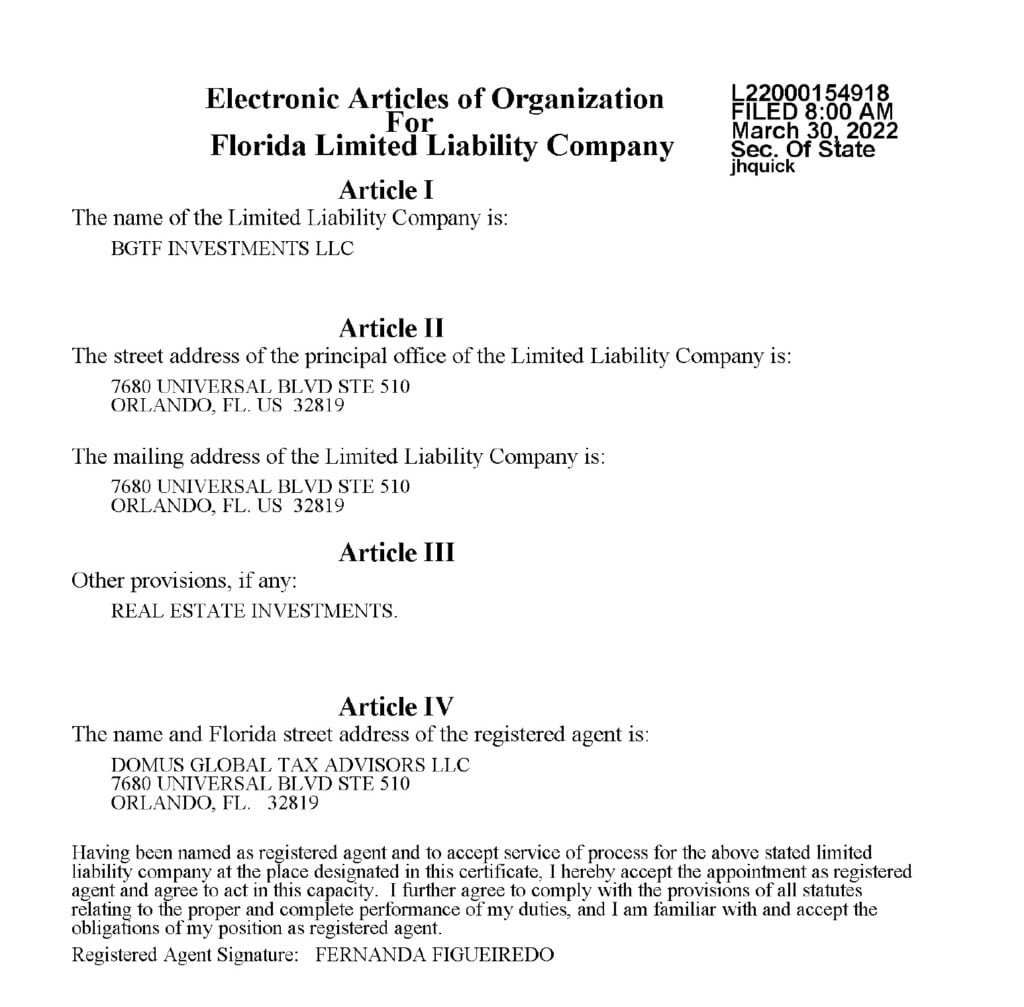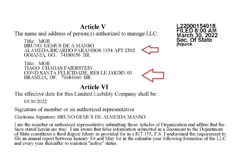 Tiago e Bruno são sócios na BGTF Investments LLC, registrada em Orlando, na Flórida. A empresa aparentemente não funciona. Até porquê, os dois sócios moram no Brasil (Bruno em Goiânia e Tiago em Brasília). Mas fica a dúvida: por qual motivo eles teriam uma sociedade na Flórida, ao passo que atuam no Brasil numa parceria público-privada?