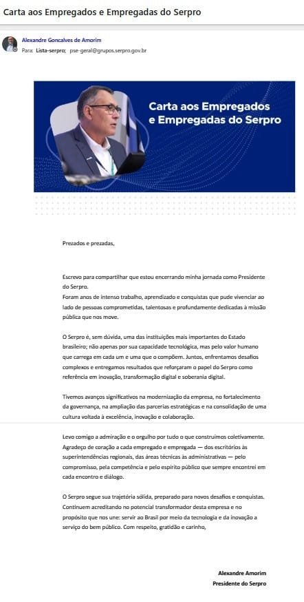 O Serpro segue sua trajetória sólida, preparado para novos desafios e conquistas. Continuem acreditando no potencial transformador desta empresa e no propósito que nos une: servir ao Brasil por meio da tecnologia e da inovação a serviço do bem público. Com respeito, gratidão e carinho,