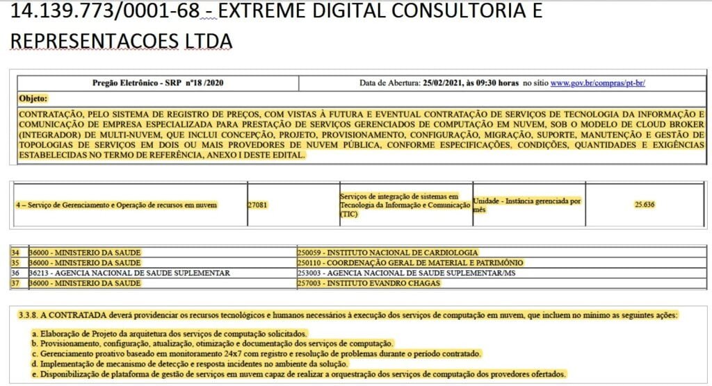 O Ministério da Saúde está hospedado na nuvem pública criada pelo Ministério da Economia desde 2019, cujo provedor é a AWS. Este ano houve uma renovação do projeto, mas a Amazon Web Services continuou a operar os contratos que já mantinha no governo, entre eles o deste ministério. Porém, no novo modelo, o Ministério da Economia passou a contar também com um integrador (broker), que é a empresa EDS – Extreme Digital Consultoria e Representações LTDA – outra a ter seu nome preservado pelo ministério em sua coletiva de imprensa. A “Nuvem Federal” como é conhecida o projeto do Ministério da Economia ainda conta com os provedores Huawei e o Google.