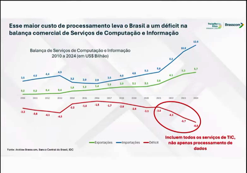 De acordo com os dados apresentados, a partir de 2021 a balança comercial de serviços digitais passou a registrar déficits anuais recordes, impulsionados pela crescente demanda por computação em nuvem e processamento de dados fora do país. A ausência de incentivos tributários tornou o Brasil menos atraente para investimentos em infraestrutura de dados, levando empresas nacionais a contratar serviços estrangeiros.