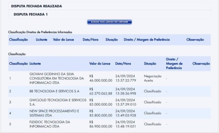 O pregão prossegue agora esperando a Caixa se manifestar na fase de habilitação da Consultoria de TI, Giovani Godinho da Silva, que apresentou o preço de R$ 46 milhões para prestar o serviço.