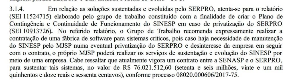 A situação na época era temerária para a pasta, porque sem o Serpro os seus sistemas e bancos de dados passariam a não contar com a manutenção estatal. Entre esses sistemas, o destaque ia para o SINESP, cuja sigla não deixa claro o tamanho da importância dele para o Ministério da Justiça: “Sistema Nacional de Informações de Segurança Pública, Prisionais, de Rastreabilidade de Armas e Munições, de Material Genético, de Digitais e de Drogas”.