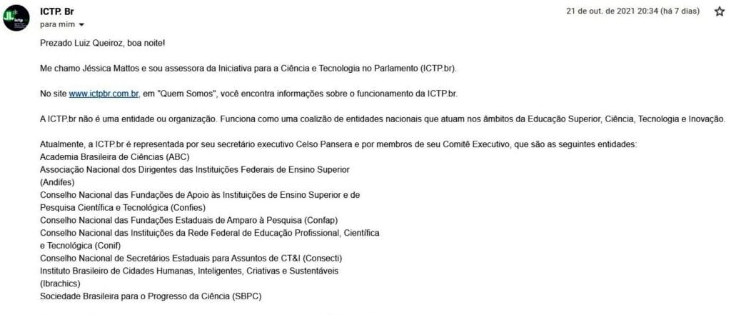 A ICTP.br – “Iniciativa para a Ciência e Tecnologia no Parlamento” foi lançada publicamente no dia 8 de maio de 2019 para defender os interesses do setor em Brasília. O movimento foi capitaneado pelas duas mais importantes entidades do meio acadêmico/científico: a Sociedade Brasileira para o Progresso da Ciência (SBPC) e a Academia Brasileira de Ciência (ABC). Não tem CNPJ, não tem sala, nem pessoal contratado (ainda). No entanto, no campo das boas intenções já funciona com o amparo logístico da SBPC, que lhe cede um espaço em seu escritório de Brasília.
