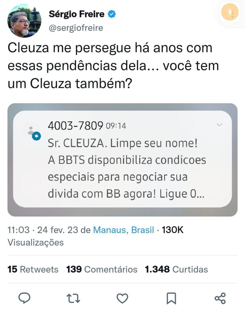O Banco do Brasil terceiriza para a sua subsidiária BBTS – BB Tecnologia e Serviços (ex-Cobra Tecnologia), o serviço de call center. Por meio da subsidiária tenta buscar, aparentemente sem sucesso, alguma renegociação para uma dívida antiga que a Cleuza tem no banco público. Como nenhuma delas atualiza o banco de dados cadastrais da Cleuza – coisa muito difícil num governo que se diz “digital” – quem acaba pagando o pato por isso é o Sérgio. Em resumo, a Cleuza se tornou a nova “IA” da BBTS: uma “inteligência para azucrinar” a vida das pessoas.