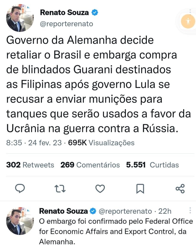 Aqui temos um clássico do que é um país que não desenvolve a sua própria tecnologia e fica dependente dos outros. A indústria bélica brasileira é impedida pela Alemanha de vender os seus blindados Guaranis para as Filipinas. Por ter se recusado a enviar munição para a artilharia da Ucrânia que está em guerra com a Rússia, conforme queriam os governantes alemães e os demais países da OTAN. Esse é a dura realidade da famosa tese de que comprar pronto qualquer coisa lá fora sai mais barato do que produzir no Brasil.