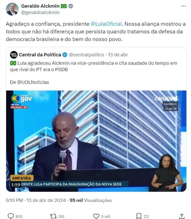 O vice-presidente e ministro da Indústria e do Comércio, Geraldo Alckmin, não deixou de usar a plataforma “X” em sua conta passoal, no sábado (13) para agradecer ao presidente Lula pelas palavras de apoio que recebeu durante evento da ANFAVEA. “Nossa aliança mostrou a todos que não há diferença que persista quando tratamos da defesa da democracia brasileira e do bem do nosso povo”, disse o vice.