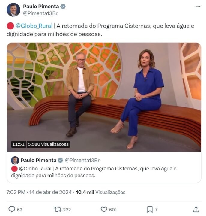 Neste último domingo não foi diferente. Só que dessa vez Pimenta compartilhou uma reportagem do programa Globo Rural, da TV Globo, na qual abordava a retomada do programa “Cisternas” pelo governo, que foi apresentado emissora. Se o exemplo para a militância é cortar dinheiro, mas continuar usando a mesma rede social, então que os simpatizantes do Governo Lula não migrem para outras plataformas de redes sociais.