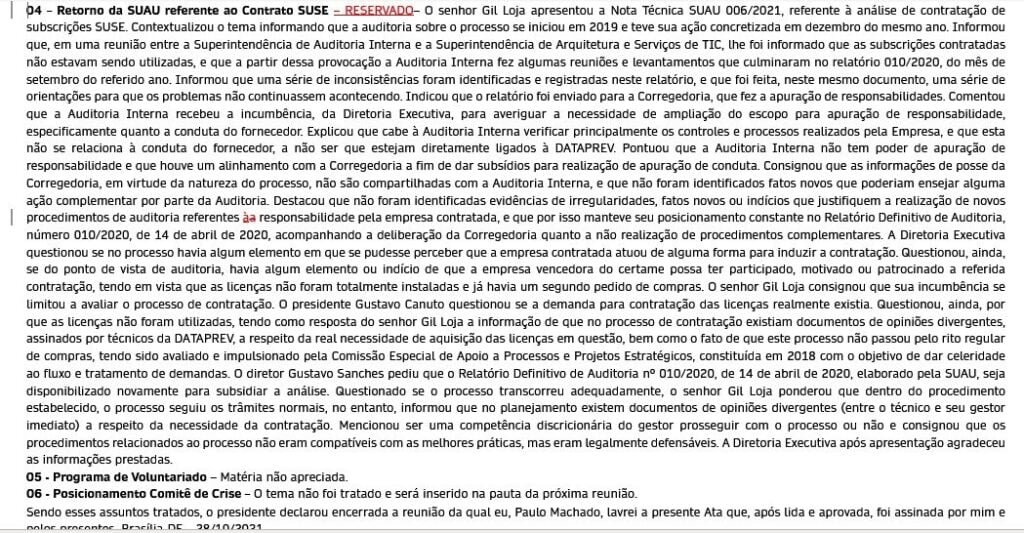Na reunião da Diretoria Executiva da Dataprev, o então chefe da Auditoria, Gil Loja, deixou claro que o órgão, após investigar o contrato SUSE, em 2020, não encontrou “evidências de irregularidades, fatos novos ou indícios” que indicassem, por exemplo, a necessidade de realização de uma nova ação para aprofundar a investigação. Na época essa auditoria foi criada com o objetivo de investigar o motivo das licenças SUSE não estarem sendo instaladas na empresa. Esse fato foi explicado pelo blog, ao tocar na decisão da ex-presidente da Dataprev, Christiane Edington, que “nomeou” e deu poderes a um diretor, que sequer teve seu nome aprovado pela Casa Civil da Presidência da República.