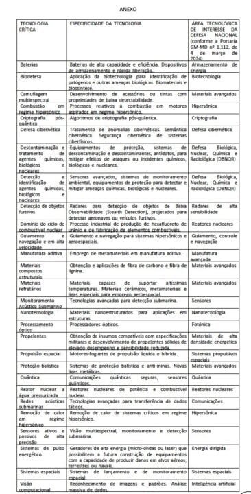 A Secretaria de Produtos de Defesa do Ministério da Defesa deverá divulgar quadrimestralmente as atualizações da relação das tecnologias, conforme as descritas no Anexo abaixo: (clique na imagem para ampliar)