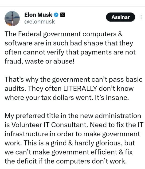 Em uma postagem na sua plataforma X (ex-Twitter), o empresário Elon Musk, futuro secretário do “Departamento de Eficiência Governamental”, criticou a tecnologia emprergada no governo norte-americano. “Os computadores e softwares do governo federal estão em tão mau estado, que muitas vezes não conseguem verificar se os pagamentos são fraude, desperdício ou abuso”, disse.
