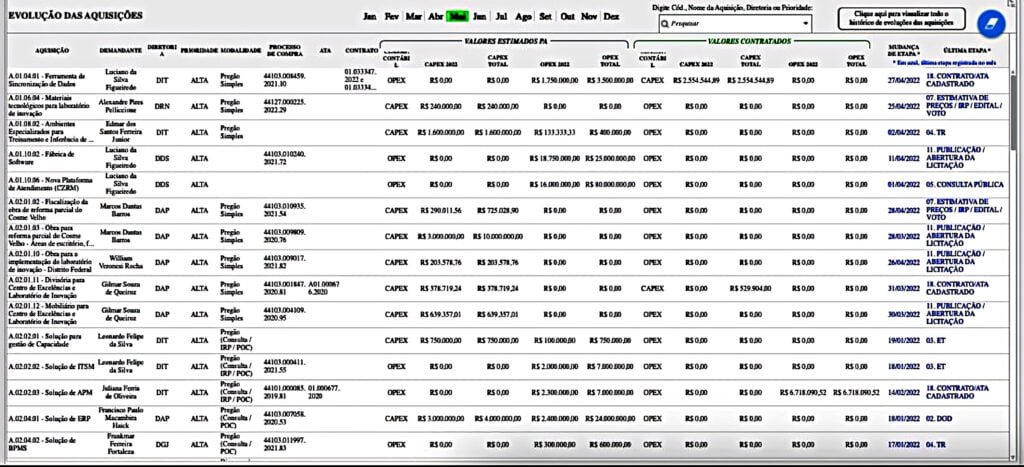 Chama a atenção, entretanto, para as compras previstas pela estatal e as prioridades que as diretorias vêm dando para elas. Por exemplo, enquanto a Diretoria de Tecnologia e Operações (DIT) opta por classificar como “prioridade alta” a aquisição de alguns softwares necessários para o andamento dos trabalhos, como o caso de “ferramentas para sincronização de dados”; a Diretoria de Administração e Pessoas (DAP) considera prioritária a compra de “divisórias” para os centros de excelência e inovação nos estados.
