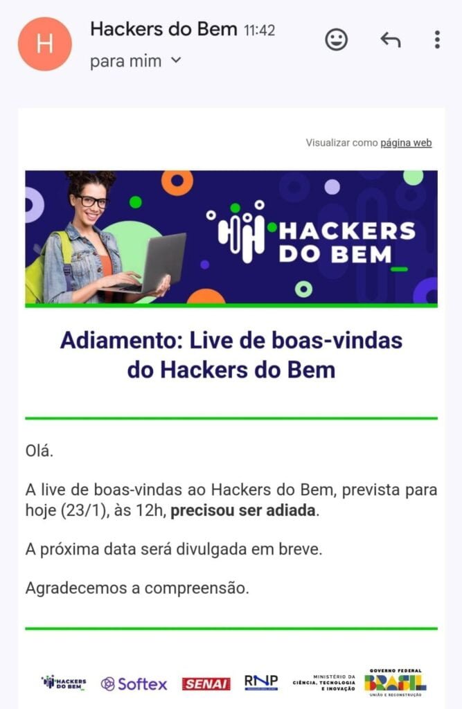 É daquelas coisas que se o blog contasse sem mostrar imagens ninguém acreditaria. Então vamos lá. A primeira “live” da Rede Nacional de Ensino e Pesquisa (RNP), que hoje (23) serviria como “aula de boas-vindas” do programa “Hacker do Bem” – criado pelo Ministério da Ciência, Tecnologia e Inovação – teve de ser adiada. Motivo: a RNP não dimensionou sua rede de Internet para abrigar tanto aluno interessado.