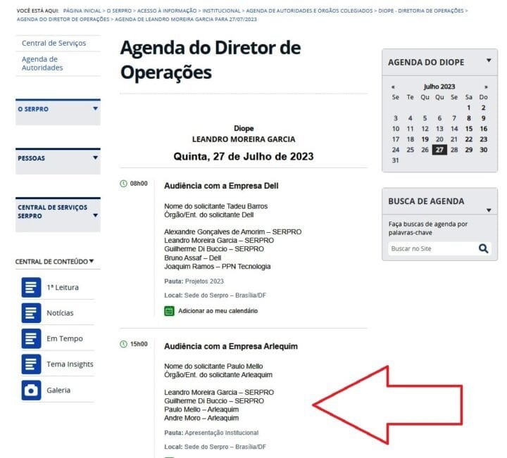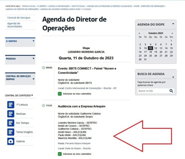 Mas o encontro entre a empresa Arlequim e o Serpro que mais chama a atenção ocorreu no dia 11 de outubro, quando faltava apenas sete dias para o início da realização da “Manifestação de Interesse” no Chamamento Público nº 1086/2023, das empresas que desejariam manter uma parceria de negócios com a estatal. A reunião também consta na agenda do diretor de Operações, Leandro Moreira Garcia, e a pauta da conversa entre as partes era clara: “Parceria Serpro-Arlequim”.