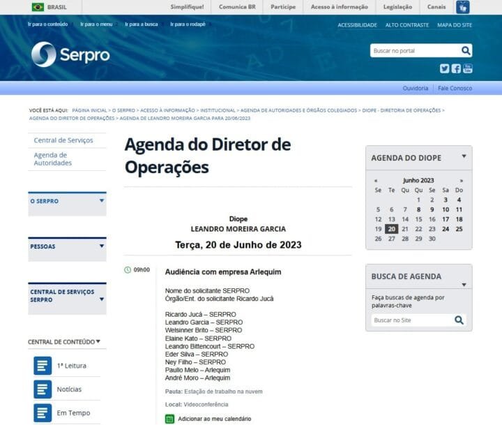 O primeiro contato da Arlequim com o Serpro, registrado em agenda da estatal, ocorreu no dia 20 de junho de 2023, quando dois executivos da empresa, Paulo Melo e André Moro, participaram de uma videoconferência com o então diretor de Operações, Leandro Moreira Garcia. Outros sete funcionários que ocupam postos de chefias na estatal estiveram presentes. O tema da reunião foi “estação de trabalho em nuvem”, projeto que três meses depois, em outubro, o Serpro realizou um “chamamento público” em busca de um parceiro.