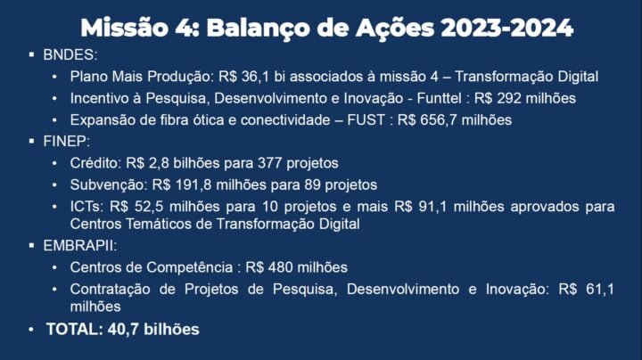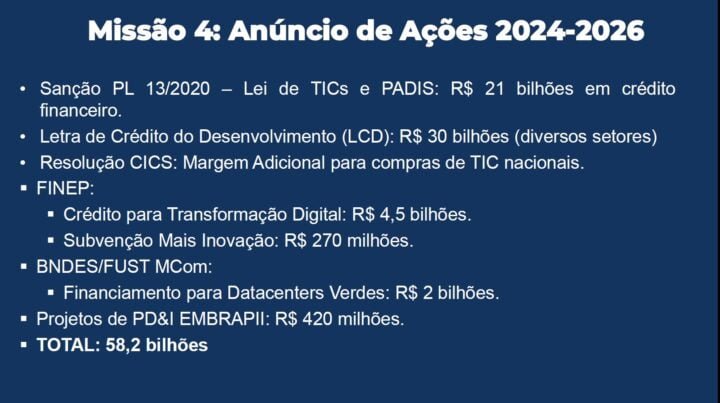 A Missão 4 tem como desafio fortalecer as cadeias produtivas de semicondutores, robôs industriais e produtos e serviços digitais avançados. Os primeiros investimentos serão direcionados à fabricação de chips, fibras óticas e robôs, instalação de datacenters e computação em nuvem, otimização de processos industriais, telecomunicação, eletromobilidade, desenvolvimento de softwares e implantação de redes de infraestrutura, entre outras áreas.