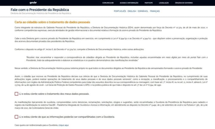 No acesso à essa página na plataforma “Fala BR” a pessoa é informada previamente que haverá coleta de suas informações pessoais. O que será feito com elas não é informado, além do fato das mensagens ao presidente ficarem guardadas depois no seu acervo pessoal. Para prosseguir com a mensagem que deseja encaminhar ao presidente Lula, o cidadão tem de manifestar que entendeu que seus dados ficarão registrados no governo. Há dois tipos de encaminhamentos dessas mensagens. As que forem direcionadas diretamente ao presidente seguirão para a equipe do seu gabinete pessoal. Já as que forem denúncias, reclamações elogios ou sugestões para o governo serão destinadas à Ouvidoria da Presidência da República.