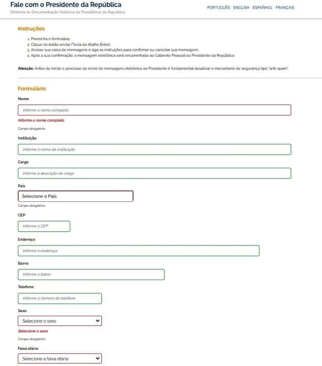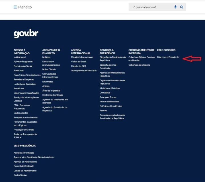 A página oficial da Presidência da República no gov.br (Planalto) não tem um canal de acesso para informações sobre a LGPD ou quem atue como o responsável pelo tratamento dos dados pessoais das pessoas que buscam enviar mensagens para Lula. Mas há uma nítida preocupação em informar as ações diárias do presidente, diversos canais com informações dos órgãos vinculados, mas nada que indique o cumprimento desta lei.