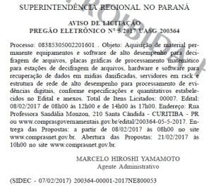 Brincadeiras à parte, Marcelo Yamamoto é um agente administrativo que acaba de publicar um aviso de pregão eletrônico da PF paranaense, que visa a “aquisição de material permanente equipamentos e software de alto desempenho para decifragem de arquivos, placas gráficas de processamento matemático para estações de decifragem de arquivos, hardware e software para recuperação de dados em mídias danificadas, servidores em rack e estrutura de rede de alto desempenho para processamento de evidências digitais“.