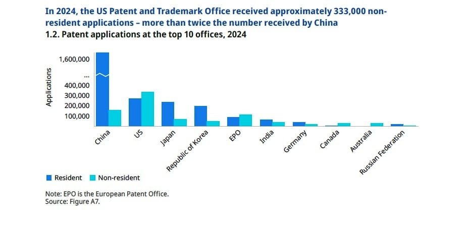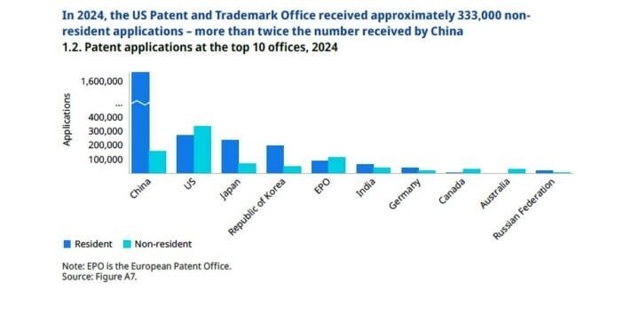 Desde 2015, o país ultrapassou a marca de 1 milhão de registros anuais e agora se aproxima rapidamente dos 2 milhões. O USPTO aparece em segundo lugar, com 603.194 pedidos, seguido por Japão (306.855), Coreia do Sul (246.245) e o Escritório Europeu de Patentes (EPO), com 199.402.