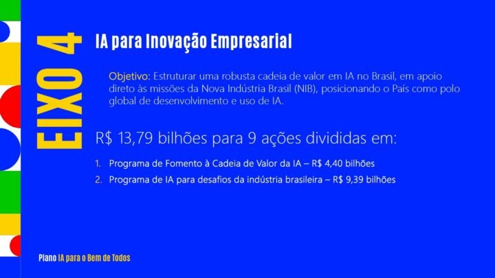 A primeira constatação que se faz do Eixo 4 do Plano Brasileiro de IA é que mudou o controle político dos investimentos do Ministério da Ciência, Tecnologia e Inovações (MCTI), para o Ministério do Desenvolvimento, Indústria, Comércio e Serviços (MDIC). O que contradiz a informação dada no lançamento pelo presidente Lula, de que pediu “um plano aos cientistas” e ele foi completamente elaborado por eles.