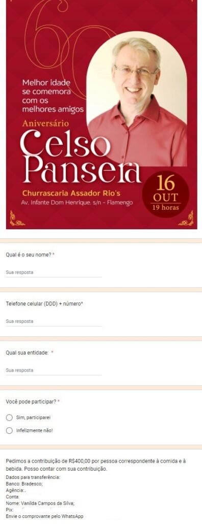 Um questionário foi criado e a resposta deve ser encaminhada para o “zapzap” da secretária do presidente da Finep, Vanilda Campos da Silva. Tem de por o nominho, o celular, dizer qual a área que trabalha e confirmar se vai ou não ao evento. Confirmando a presença, então tem de fazer um “Pix” para a conta bancária da Vanilda. (preservei os seus dados, viu?)