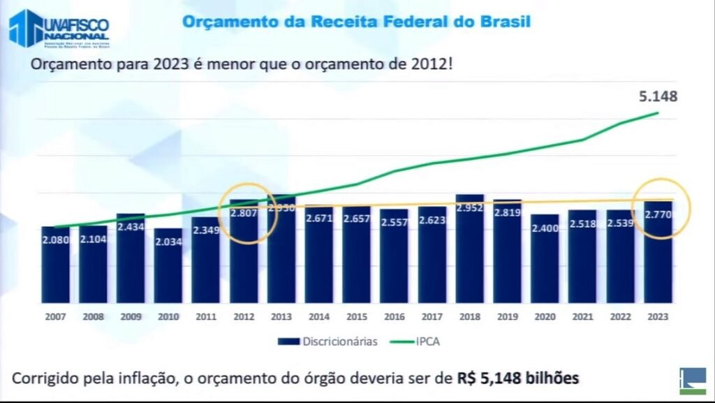Segundo ele, o orçamento deste ano (2023) da Receita Federal, está previsto em R$ 2,7 bilhões. Praticamente está no mesmo patamar do orçamento definido em 2012, com pouca variação nos anos seguintes. Se fosse corrigido pelo IPCA (Índice Nacional de Preços ao Consumidor Amplo – que mede a variação dos preços de produtos e serviços vendidos no varejo e consumidos pelas famílias), hoje a previsão orçamentária da Receita Federal deveria estar em R$ 5,1 bilhões.