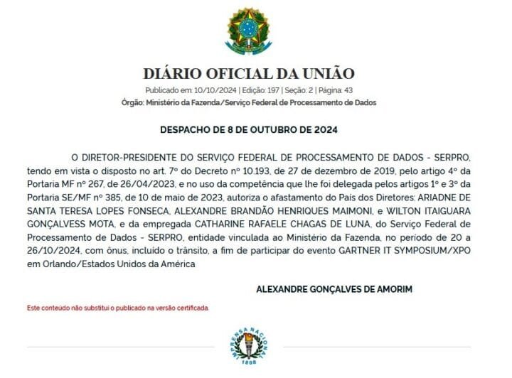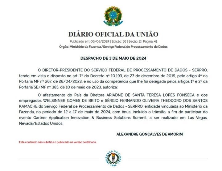 No ano passado, antes da assinatura do acordo de R$ 19,5 milhões, a diretora de Negócios Econômico-Fazendários do Serpro, Ariadne Fonseca, participou entre os dias 12 a 17 de maio do “Gartner Application Innovation & Business Solutions Summit, realizado em Las Vegas. Ela foi acompanhada do Superintendente de Arquitetura Corporativa Plataformas e Nuvem, Welsinner Brito; e do Assessor da Diretoria de Negócios Econômico Fazendários, Sergio dos Santos Kamache.