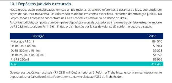 Mesmo tendo em seus quadros advogados para resolverem os impasses judiciais trabalhistas, que trabalham diretamente na Diretoria Jurídica, de Gestão e Riscos (Dijug), o Conselho de Administração da estatal aprovou a contratação de um escritório especializado no serviço. No balanço financeiro do ano passado a estatal contabilizou um total de R$ 419 milhões em depósitos judiciais que foi obrigada a fazer para eventual pagamento de ações trabalhistas. A tendência é esse valor disparar ainda mais, caso o presidente da empresa, Alexandre Amorim, resolva a colocar em prática um processo de demissão em massa de mil trabalhadores, segundo comentários internos na estatal.