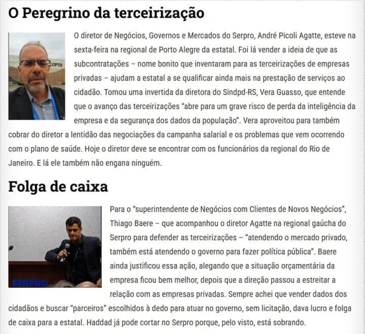 Essa desculpa das terceirizações vem sendo dada pelo diretor de Negócios, Governos e Mercados, André Picoli Agatte, que junto com o seu superintendente de “Negócios com Clientes de Novos Negócios”, Thiago Baere, andou fazendo peregrinação nas regionais da empresa para angariar apoios ao projeto. Que no jargão sindical tem a cara de ser um processo de “privatização branca”. A denúncia foi dada pela coluna deste blog no último dia 2 de junho.