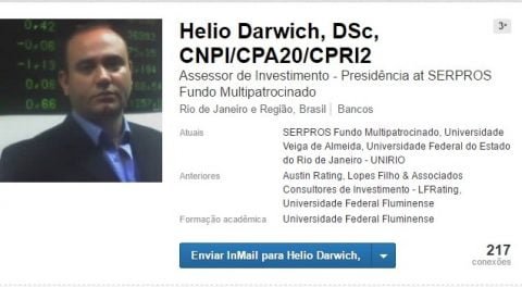 Vem a ser o “Assessor de Investimentos” do SERPROS, conforme ainda se anuncia no Linkedin, cargo que ocupou durante a intervenção comandada por Walter de Carvalho Parente, da Previc. O “sr Hélio” atuava como Analista de Risco na dobradinha das agências de classificação de risco Austing Rating e LF Rating.