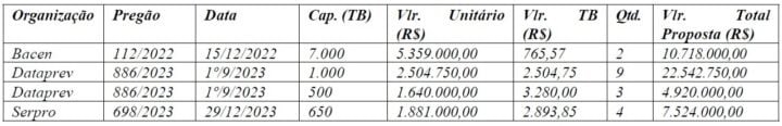 No caso de contratações de storage, o TCU constatou discrepâncias de preços em licitações da Empresa de Tecnologia e Informações da Previdência (Dataprev), do Serviço Federal de Processamento de Dados (Serpro) e do Banco Central (Bacen). Soluções do mesmo fabricante e os modelos ofertados, similares, com itens comuns entre eles, tinham preços bastante diferentes, a depender de quem estava comprando. O Banco Central foi disparado o que menos pagou nessas contratações, levando em conta o volume de dados a serem armazenados e o preço: