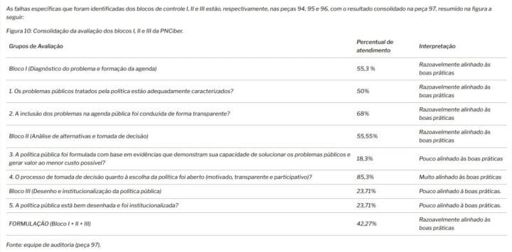 Resposta: O estágio de formulação (Blocos I, II e III do RCPP), momento no qual problemas e intervenções públicos são analisados e selecionados para compor a agenda pública e o portfólio de ações governamentais, da PNCiber está razoavelmente alinhado às boas práticas, sendo a principal falha a incoerência do modelo adotado com o problema identificado, o que não contribui, de forma suficiente, para alcance dos seus objetivos (art. 3º, Decreto 11.856/2023) (peça 97, p. 11).