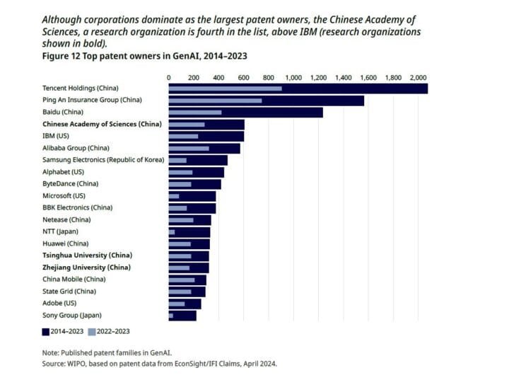 Em meados do ano passado a WIPO divulgou o seu “Relatório de Panorama de Patentes sobre Inteligência Artificial Gerativa” e mostrou que, num ranking global de detentores de patentes registradas, a China está disparado na frente em relação aos EUA e o resto do mundo. A melhor empresa americana posicionada nesses ranking é a IBM mas, mesmo assim, está na quarta posição no confronto com as comporações chinesas e na quinta, se considerado a presença Academia Chinesa de Ciências.