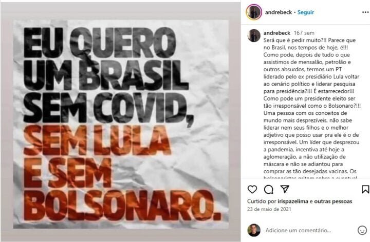 Outro sócio da WideLabs, que por sua posição política chama a atenção é André Beck, o mais recente na sociedade. Ele se apresenta no LinkedIn como dono da “Vibra Comunicação”, empresa que teria sido responsável pela “carreira do cavaleiro olímpico Rodrigo Pessoa, administrando seus contratos de patrocínio com a Globo.com, Vasco da Gama e Embraer”.